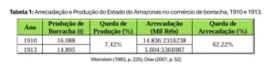 Tabela 1: Arrecadação e Produção do Estado do Amazonas no comércio de borracha, 1910 e 1913.