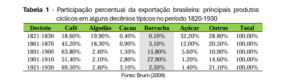 Tabela 1 – Participação percentual da exportação brasileira: principais produtos cíclicos em alguns decênios típicos no período 1820-1930