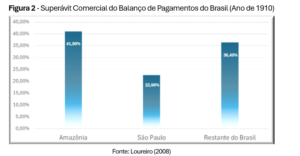 Ainda em 1910, o superávit da Balança de Pagamentos do Brasil evidenciava a relevância da região amazônica, responsável por mais de 40% do saldo positivo daquele ano (Figura 2). Embora São Paulo gerasse mais de 42% dos recursos que ingressavam no Tesouro Nacional por meio do café, os impactos das importações locais diminuíam o superávit paulista. Em contraste, as contas da Amazônia mantinham-se equilibradas, mesmo com a dependência de produtos vindos de outros estados. Esses dados reforçam a importância da receita do comércio da borracha para a contabilidade nacional.