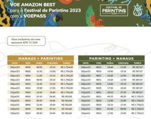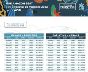 A Azul dispõe de 26 opções de voo entre os dias 29 de junho e 4 de julho, além de oferecer pacotes aos interessados em participar de um dois maiores espetáculos de cultura popular do mundo. Já a VoePass tem 24 voos disponíveis para o Festival de Parintins, operando de 28 de junho a 3 de julho.