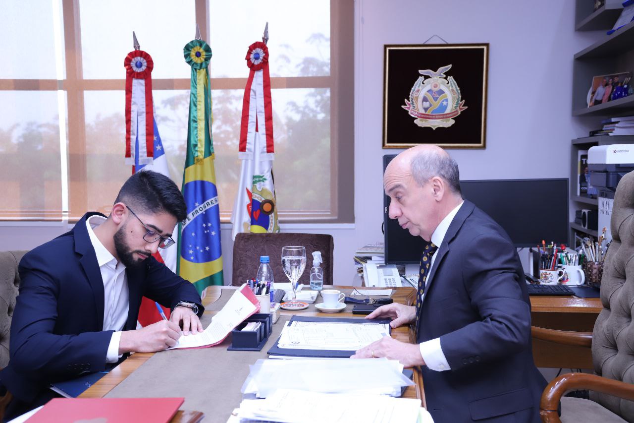 Clebio Camilo de Sousa e Dayvson Carlos de Almeida tomaram posse como auditores técnicos de Obras Públicas. O terceiro empossado, Lucas Kenji Gomes, atuará na Auditoria Governamental.