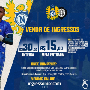 O Nacional Futebol Clube divulgou, nesta quinta-feira (26/01), em suas redes sociais, os valores dos ingressos para o clássico de abertura do Campeonato Amazonas, neste sábado (28), às 20h, na Arena da Amazônia, contra o Rio Negro. O torcedor pagará R$ 30 (inteira) R$ 15 (meia-entrada) para assistir ao duelo Rio-Nal.