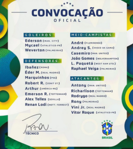 A convocação conta, ainda, com 11 remanescentes da Copa: os goleiros Ederson e Weverton, o lateral Alex Telles, os zagueiros Eder Militão e Marquinhos, o volante Casemiro, o meia Lucas Paquetá e os atacantes Antony, Richarlison, Rodrygo e Vinícius Júnior. Os laterais Emerson Royal e Renan Lodi e o zagueiro Ibañez, convocados em outras ocasiões à seleção, receberam nova chance. A média de idade da lista é de 24 anos.