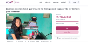 “Abrimos essa vaquinha para custear o material didático de estudo (que para engenharia é bem caro) e também para que ela consiga se manter nos cinco anos de duração do curso, mesmo já tendo ganho abrigo estudantil, ofertado pela própria universidade depois de toda repercussão”, justifica a ONG na descrição da “vaquinha virtual”.