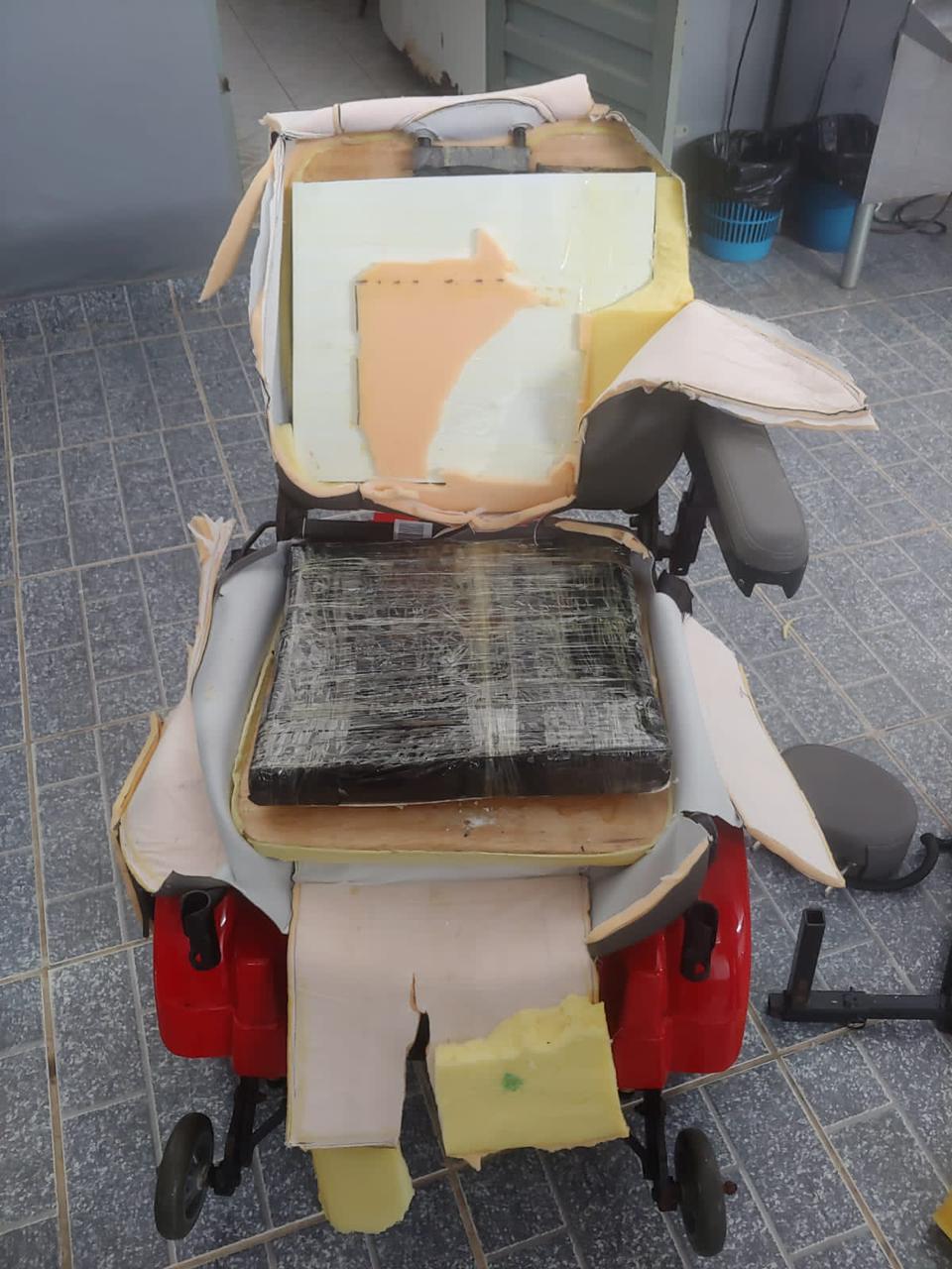estava escondida dentro do revestimento do assento de uma cadeira de rodas.