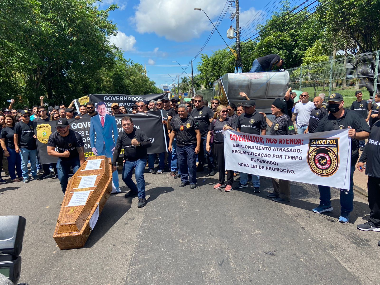 Por escalonamento, policiais civis usam caixão com imagem de Wilson Lima