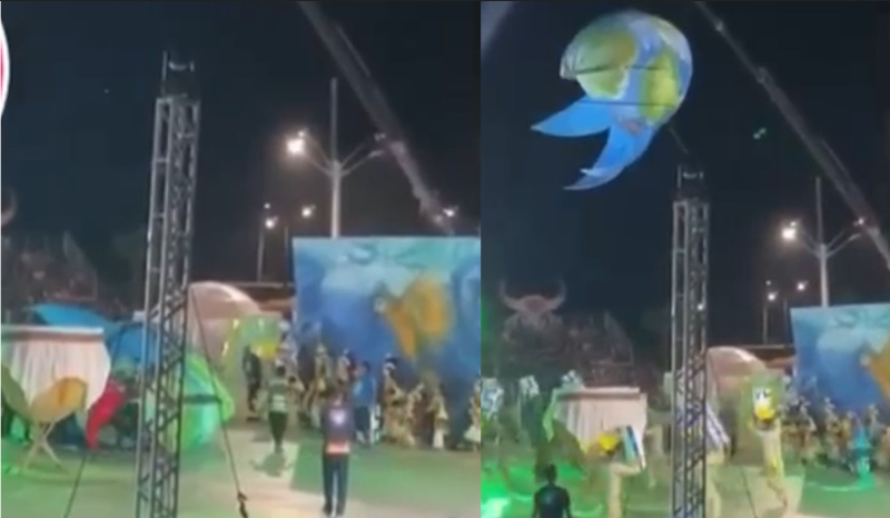 Um vídeo que circula em redes sociais mostra o exato momento que a alegoria cai de uma altura de cerca de 8 metros.