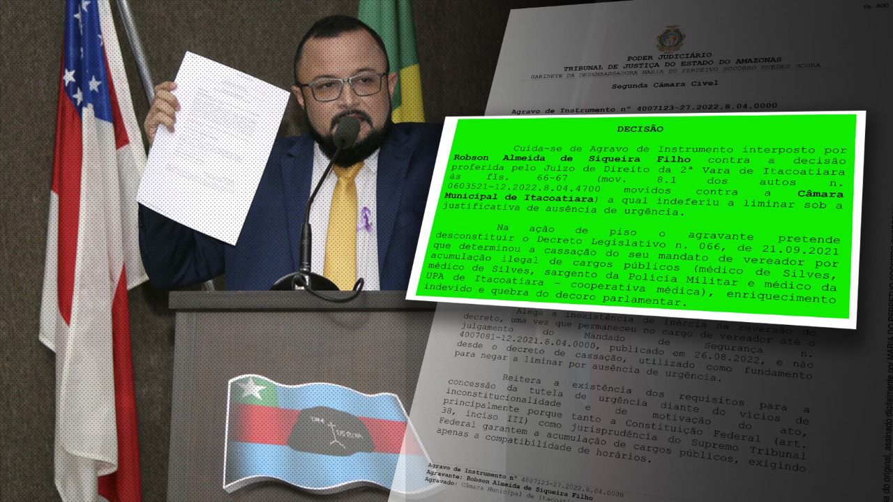 A nova decisão que suspende primeira ação por quebra de decoro por acúmulo de cargos públicos é da desembargadora Maria do Perpétuo Socorro Guedes que afirma não ter identificado prejuízos no exercício parlamentar. Antes de ser eleito como vereador, Robson Siqueira já atuava como médico em unidades da saúde da prefeitura de Silves e do governo do AM. Ele também mantinha patente de sargento da Polícia Militar, hoje na reserva.
