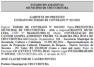 De acordo com o Portal Norte Notícias, a empresa contratada para realizar o show do padre Antônio, no dia 7 de agosto, é a Cana Produções e MS LTDA, inscrita no CNPJ 22.518.056/0001-71. Já para a realização do show do cantor gospel Anderson Freire, a empresa contratada é a Criative Music Ltda, inscrita no CPNJ 08.648.622/0001-32. O show será na Marcha para Jesus de Urucurituba.