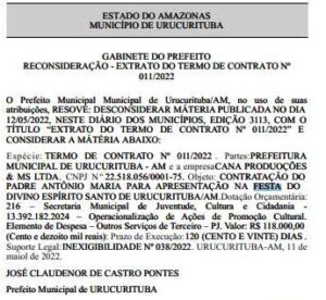 Segundo reportagem do Portal Norte Notícias, a Prefeitura de Urucurituba reconsiderou o valor pelo show do padre Antônio Maria que havia sido publicado no Diário Oficial do Municípios (DOM), da última quinta-feira (12). Inicialmente, a prefeitura pagaria R$ 500 mil pelo evento envolvendo o religioso, mas a assessoria de imprensa do padre informou ao site que o cachê para o evento é de R$ 118 mil. Ontem mesmo, a prefeitura urucuritubense publicou novo extrato reconsiderando o valor para R$ 118 mil.