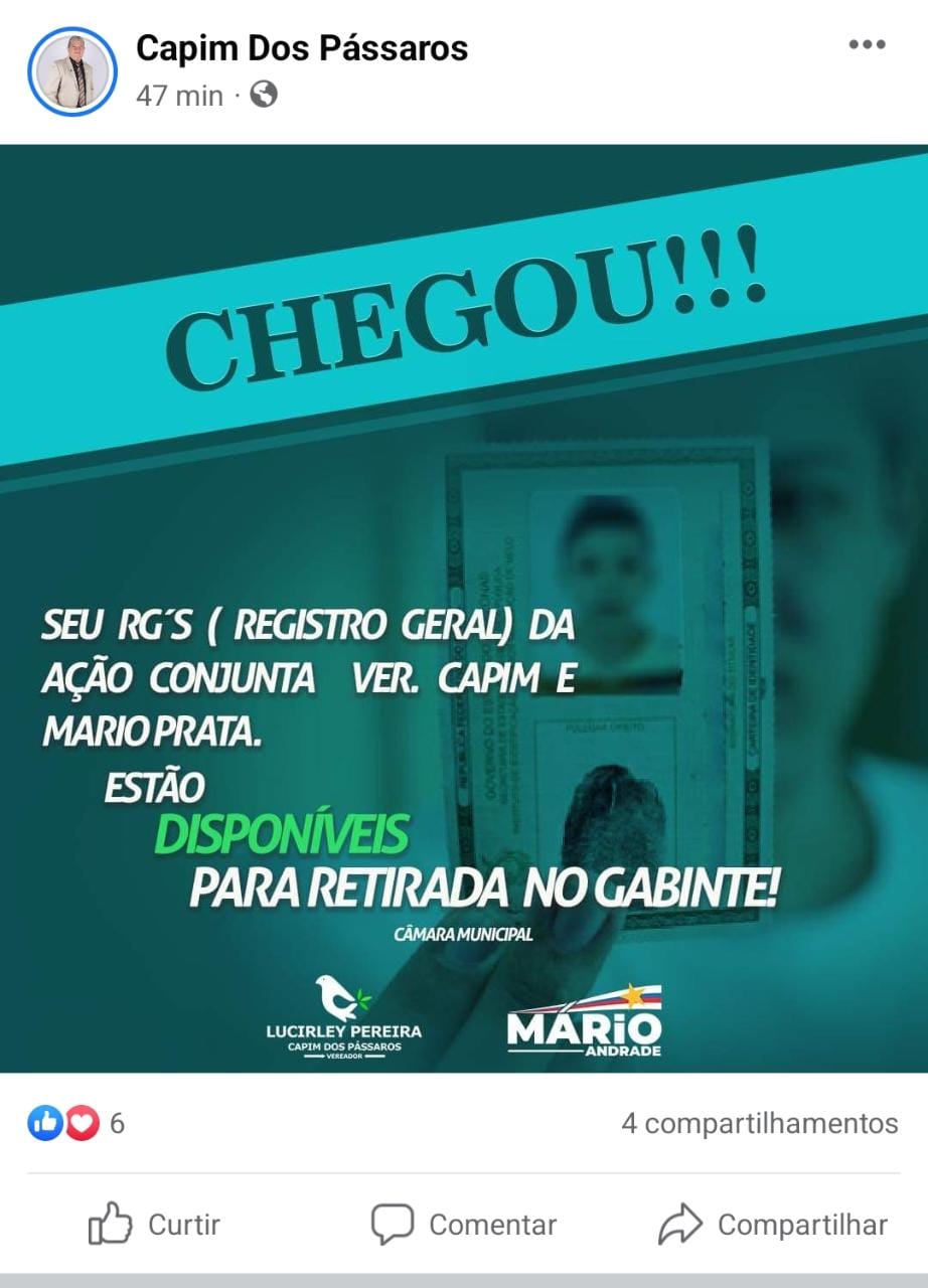 No post, o vereador Capim dos Pássaros informa que a emissão dos RGs é fruto de uma ação conjunta entre ele e o vereador Mário. “Seus RGs (Registro Geral) da Ação Conjunta Ver. Capim e Mario Prata estão disponíveis para retirada no gabinete! Câmara Municiapal”, diz o card publicado por Capim dos Pássaros.